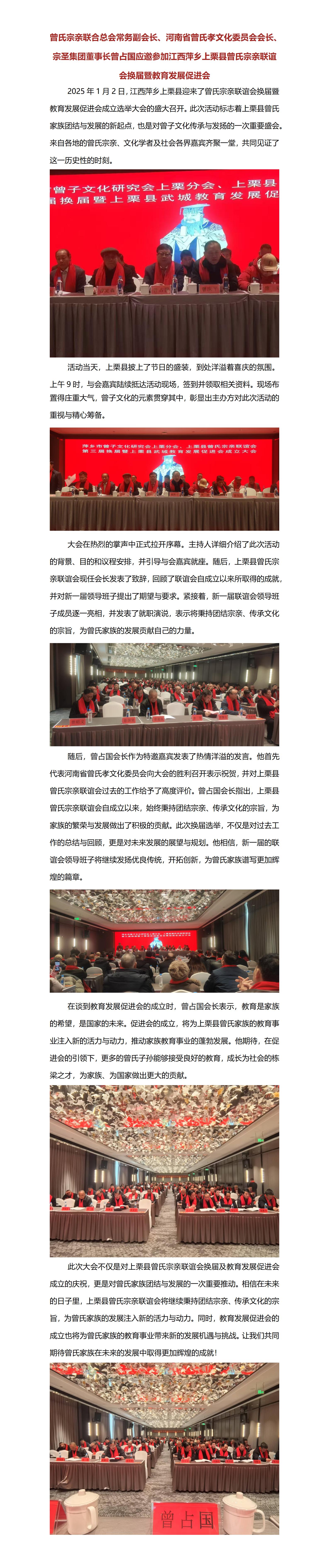 曾氏宗親聯(lián)合總會常務副會長、河南省曾氏孝文化委員會會長、宗圣集團董事長曾占國應邀參加江西萍鄉(xiāng)上栗縣曾氏宗親聯(lián)誼會換屆暨教育發(fā)展促進會